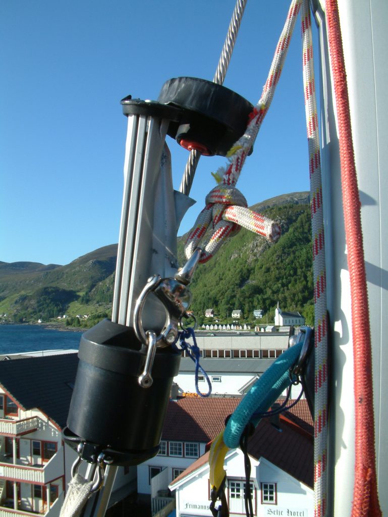 For å unngå halyard wrap er det avgjørende at det er korrekt vinkel mellom fall og forstag.